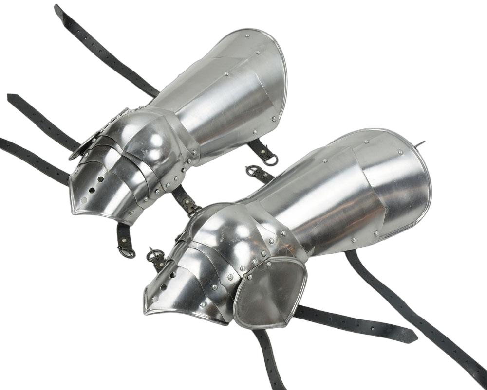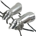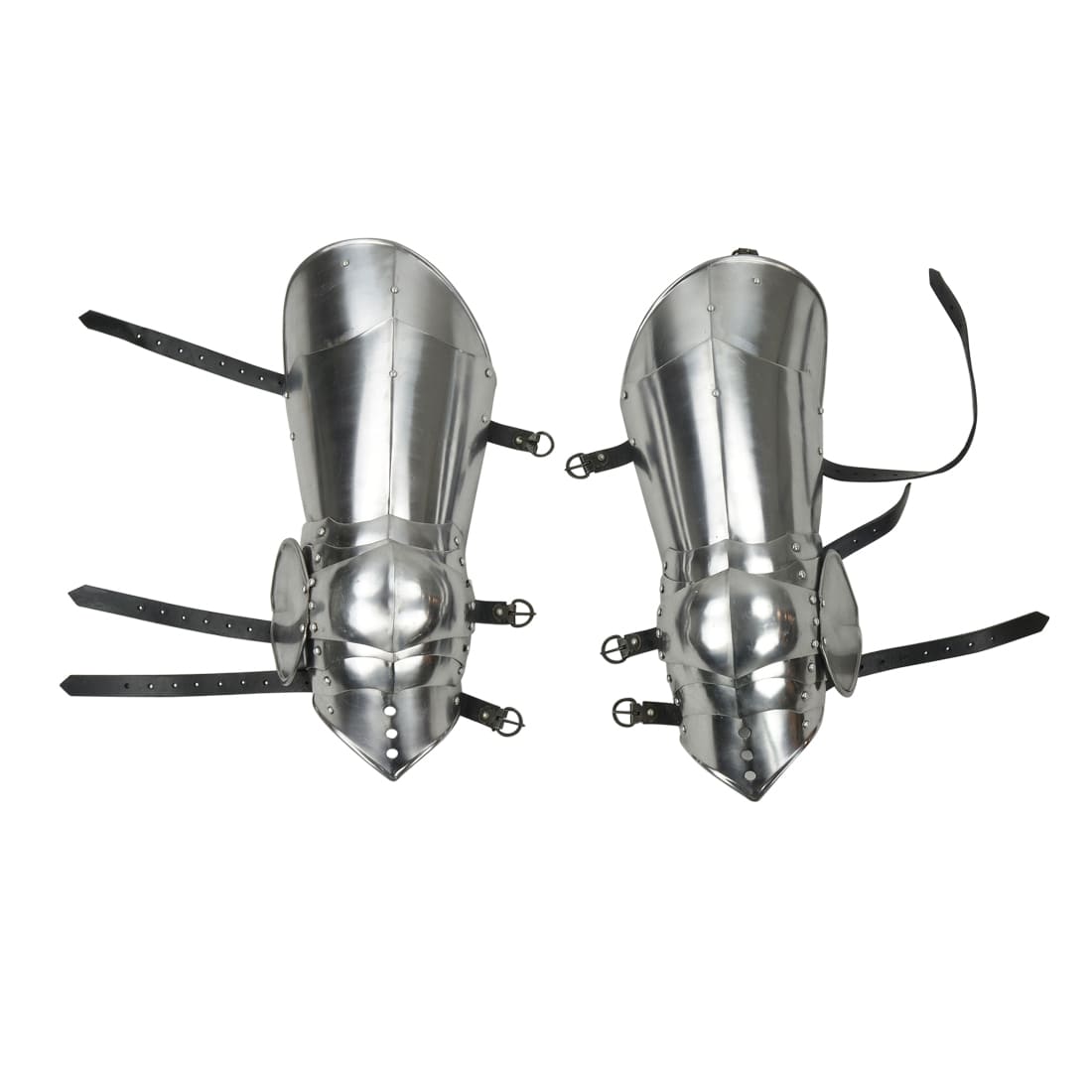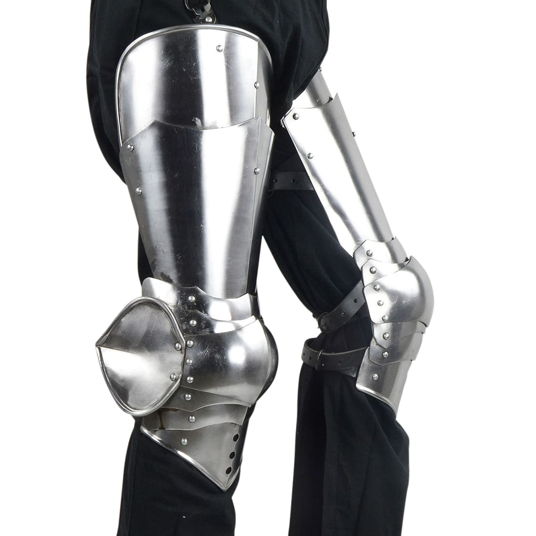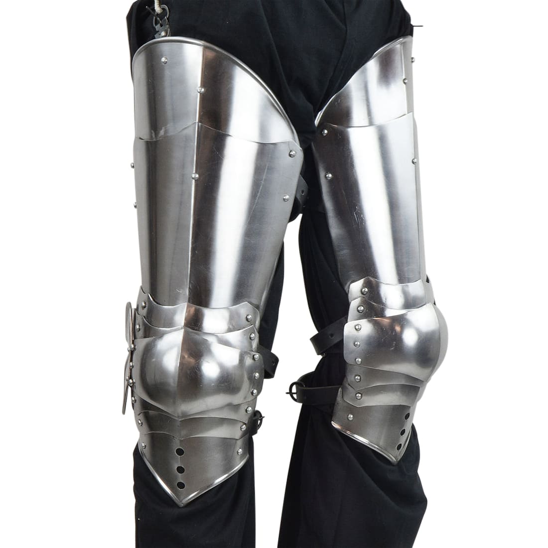 This set of Gothic style leg armor is constructed from 16 gauge steel – it is well articulated with its swivel-rivet construction. A set of antiqued steel buckles and adjustable leather straps attach and fit the armor onto the leg. A buckle at the top of the armor allows it to be buckled onto another piece of armor or a belt for support. For display purposes we simply tied them into position to simulate this.