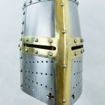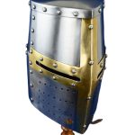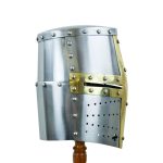 This 14th Century Great Helm is crafted from stoutly riveted plates of 16 gauge steel; the riveted ocular cross is of brass. The helm is blackened on the inside and fitted with an integrated leather suspension liner that can be adjusted to size to optimize the fit of the helm. An adjustable chin strap of leather with a brass buckle completes this helm.SIZING INFO: