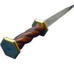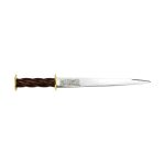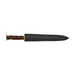 This Medieval Rondel Dagger has a long piercing blade of high carbon steel which is securely mounted into a hilt with a spiralled grip of carved wood which is surmounted by rondels of brass. Scrollwork etching adorns the base of the blade and included is a sturdy leather sheath with a belt loop for easy wear.