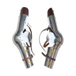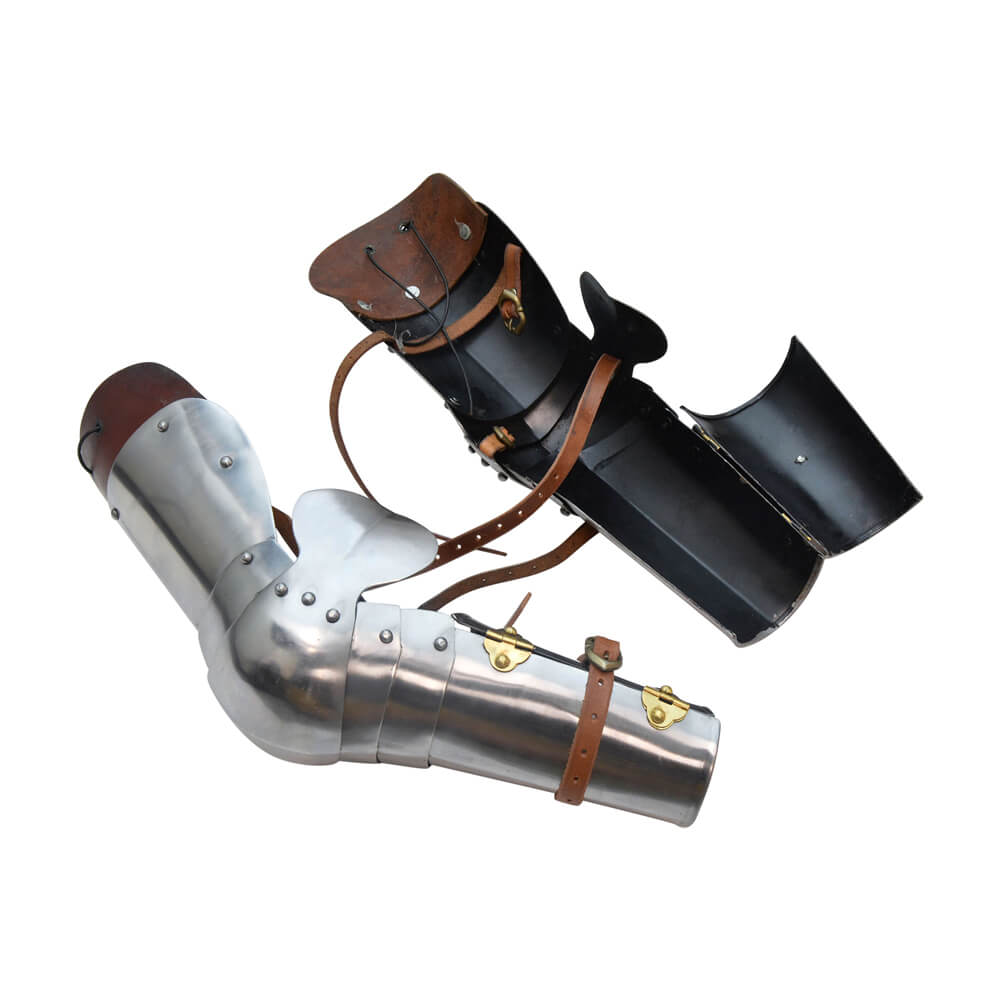 This set of 15th Century Arm Armor is constructed from plates of 18 gauge steel and well-articulated to allow for very good freedom of movement. The armor is secured to the arms with adjustable brass buckles and leather straps. A large leather tab gives additional insulation from chafing to the upper arm and shoulder. The interior of the armor is blackened to give it some resistance to rust.