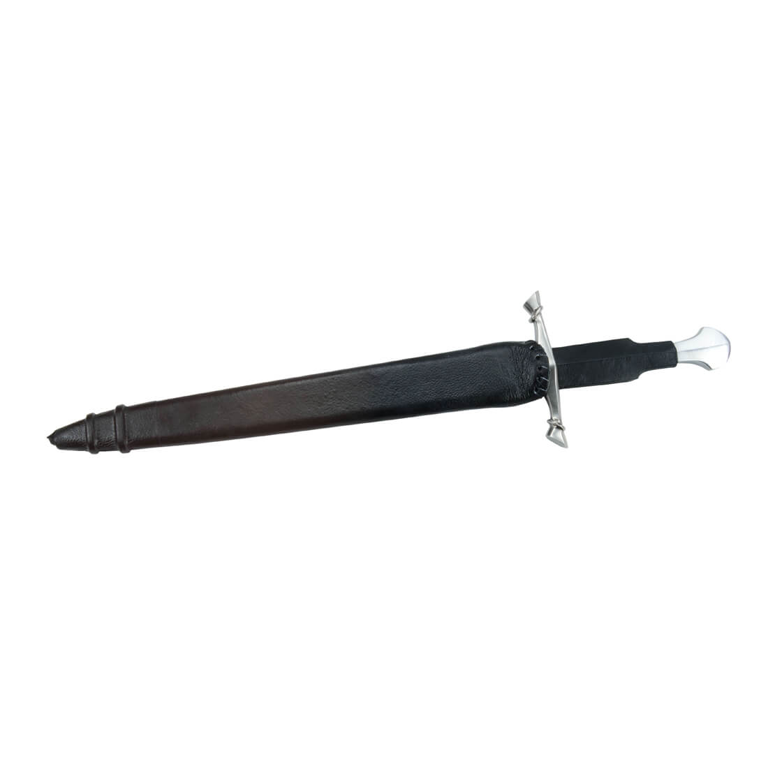 This 15th Century Dagger has a thick-edges and rounded blade designed for stage and sport combat. The blade is high carbon steel and the crossguard and pommel of the hilt are steel. The contoured grip is wood with a tight leather wrap. Included with the dagger is a wooden scabbard which is bound in black leather for a finish. A matching dagger to this sword is available separately.