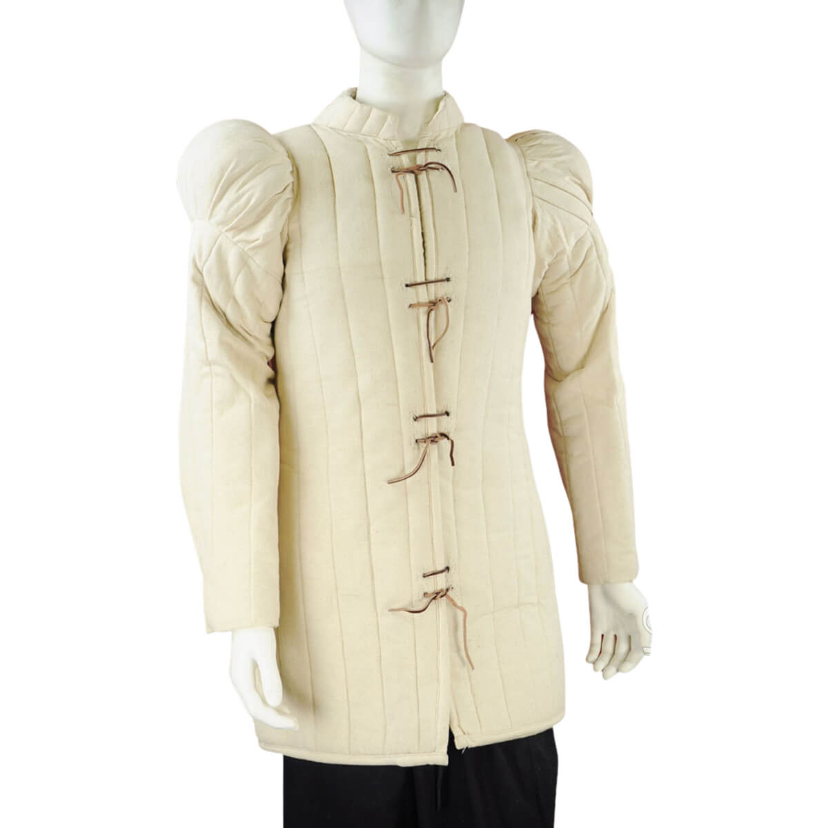 This thick quilted 15th Century gambeson with padded shoulders is crafted from thick cotton and is fastened in the front with leather lacings. The interior of the gambeson is lined with cotton felt. As this gambeson is crafted from organic material, it will breathe better than other poly-fill gambesons on the market.