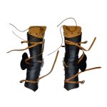 This well-articulated set of 15th century medieval leg armor is constructed from plates of 18 gauge steel. A set of leather straps and adjustable brass buckles fit the armor to the leg and a large leather tab prevents the armor from digging into the thigh.