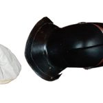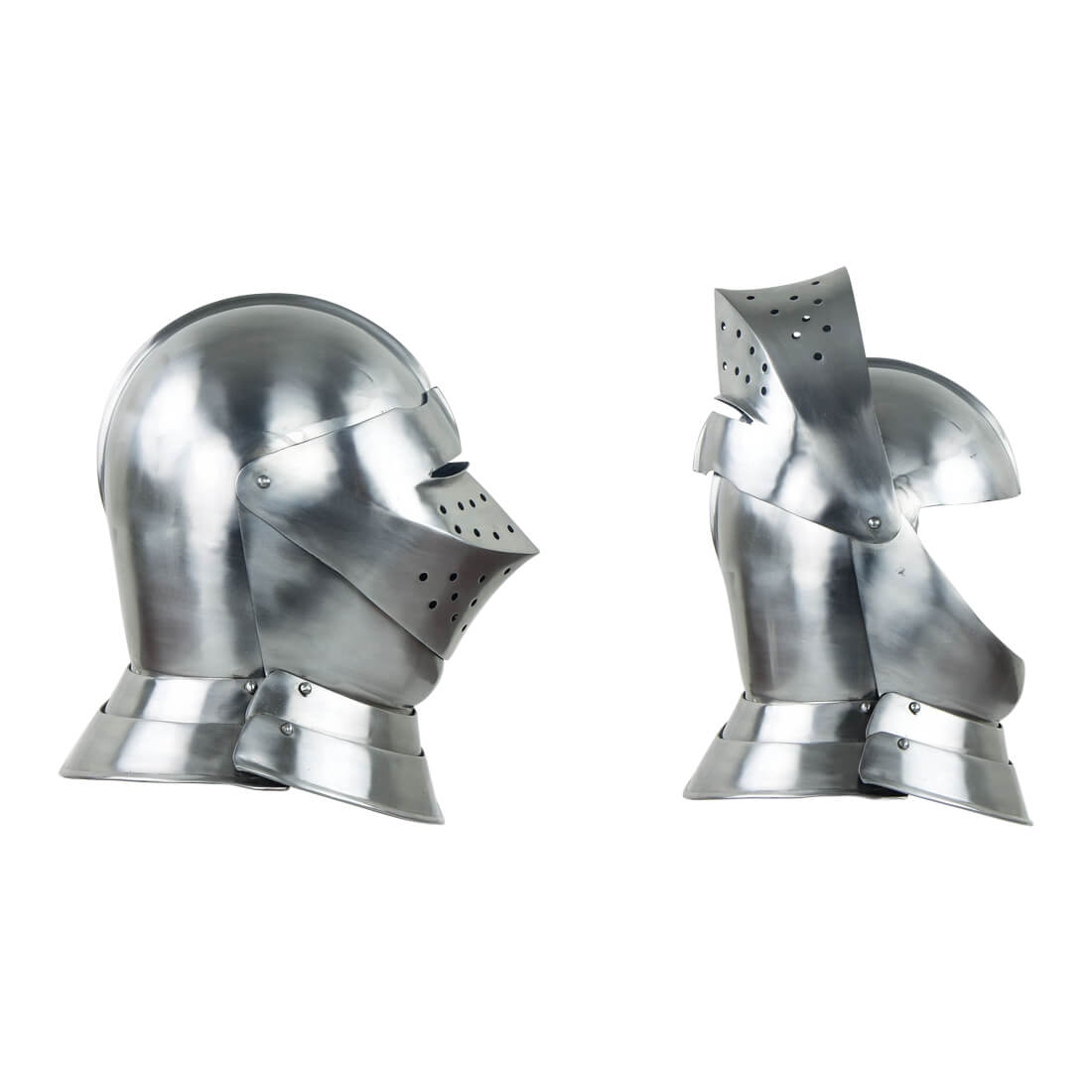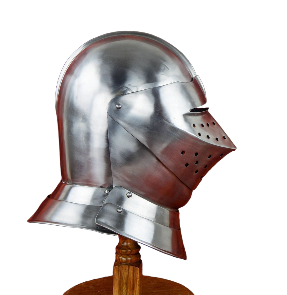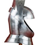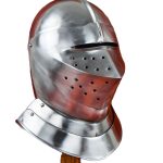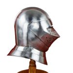 This English Close Helm is constructed from 16 gauge steel. Not only is the visor articulated but the front half of the helm can be raised to allow the helm to be fitted around the helm. The interior of the helmet is blackened and unlined. The helmet comes with a separate padded cotton arming cap.