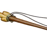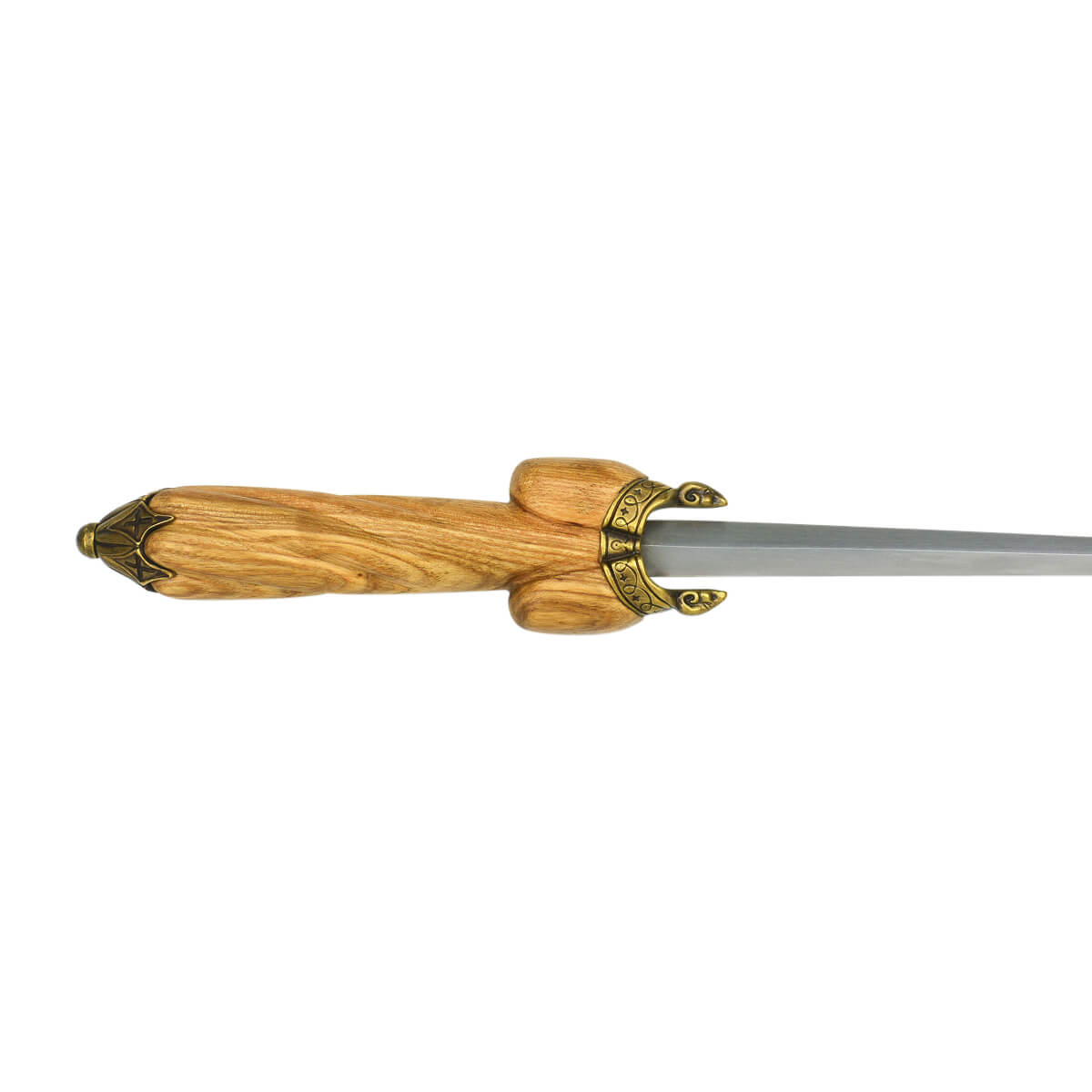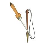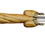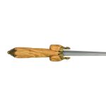 The hilt is finely carved from wood and the pommel cap and guard plate are crafted from antiqued brass. Included is a quality sheath of leather of vegetable tanned leather with a large chape cap of antiqued brass and a belt tying cord of leather.
