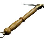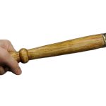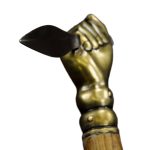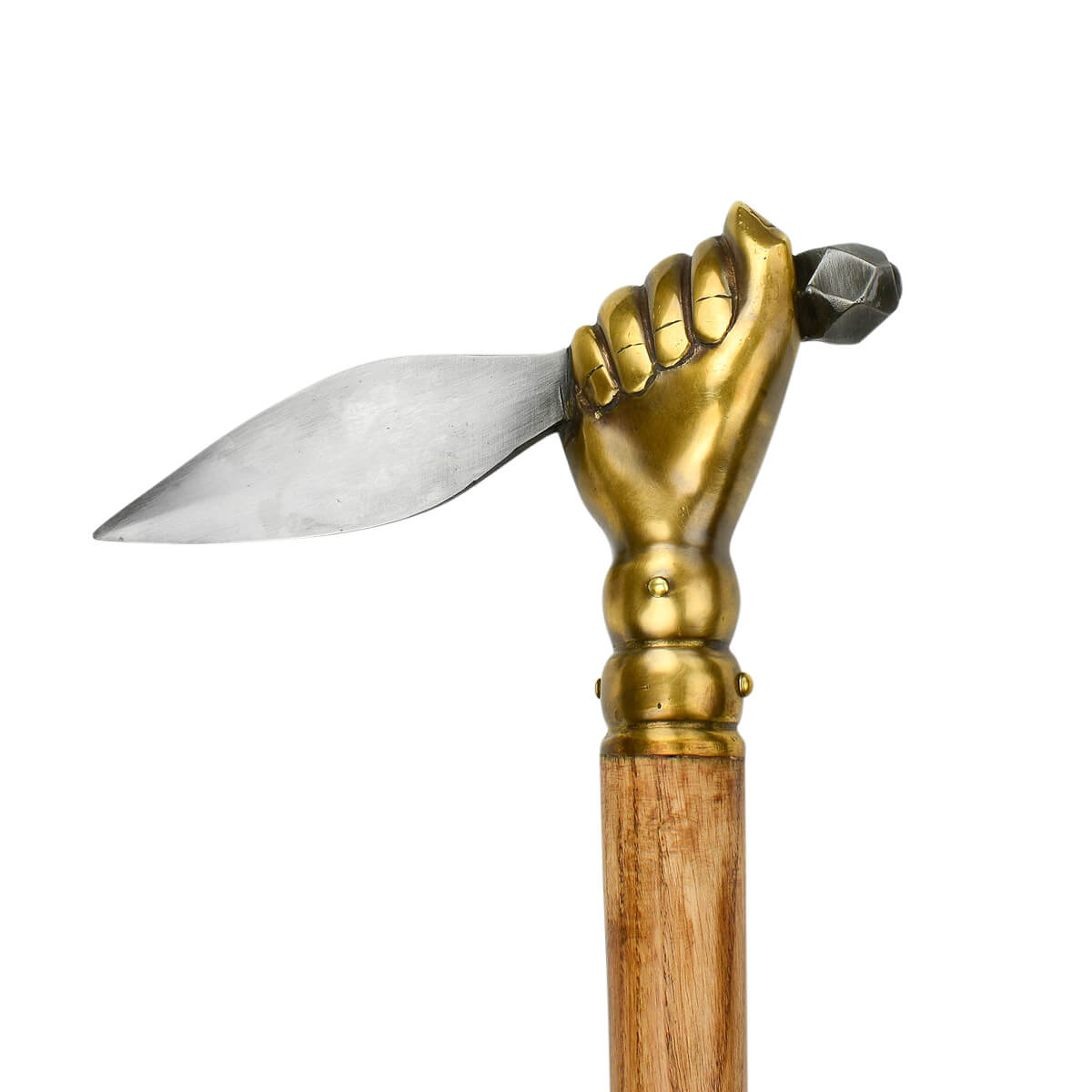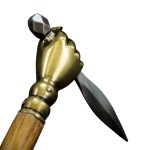 The fist is made of antiqued brass and is mounted onto a stout wooden haft and reinforced with rivets. A brass hanging ring on the end of the handle completes this most wicked of weapons.