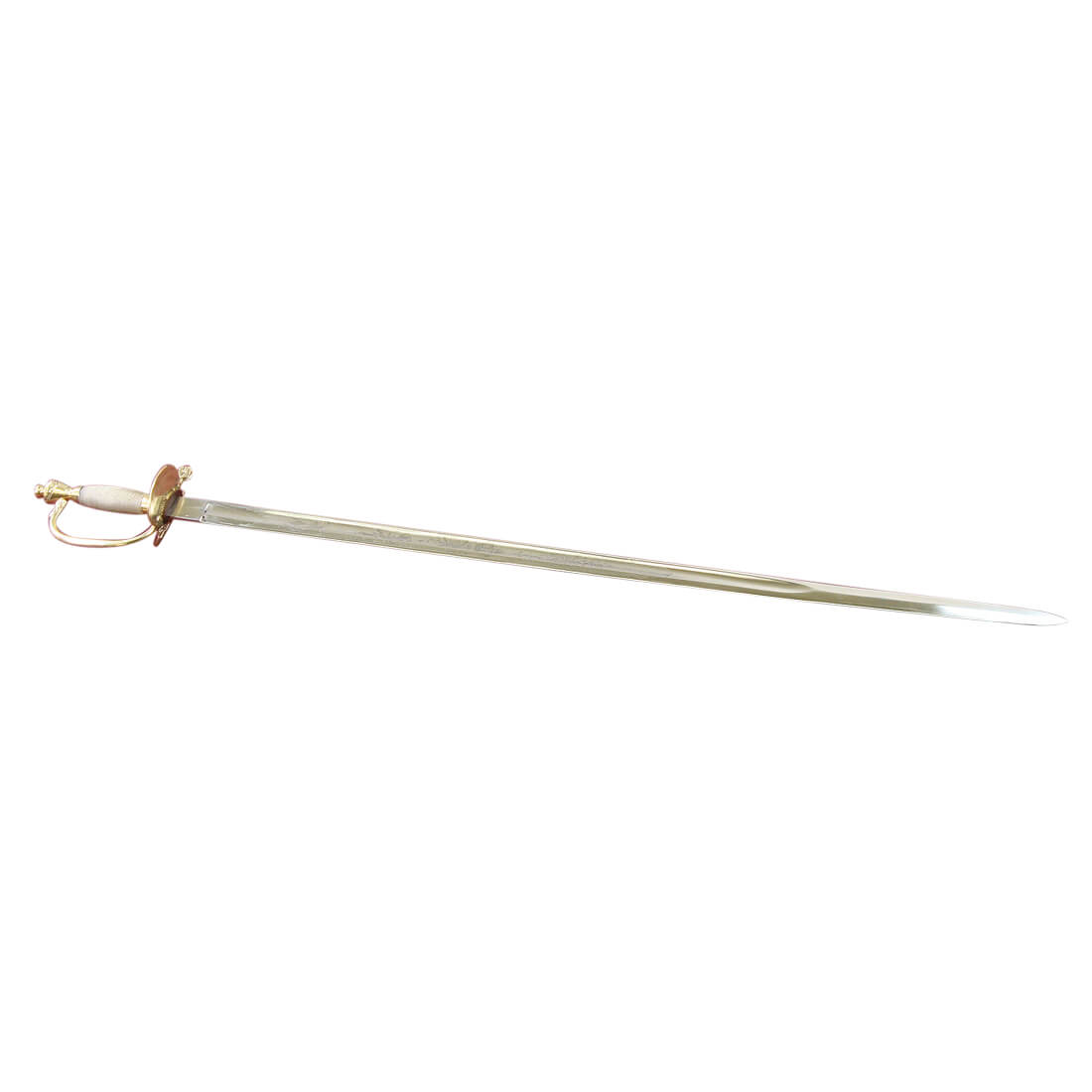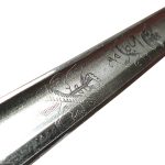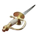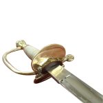 This replica of the 1796 British Infantry Officer sword has a blade of unsharpened, tempered high carbon steel. Both sides of the blade feature the embossed cyper of the British Crown surmounted extensively by royal devices and floral motifs. It has a hilt of brass and a grip wrapped in copper wire that is plated with silver. Half of the guard is hinged and folds for ease of carry at the hip. The scabbard is of leather with brass accents.