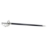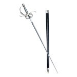 This Rapier has a blade forged from high carbon steel; the complex hilt is mild steel with a wooden grip overlaid in twisted steel wire. The wood-core scabbard is finished with a tight leather wrap and protective steel fittings. The base of the blade is wrapped in leather to give the hand an improved grip when using the above-crossguard finger rings.