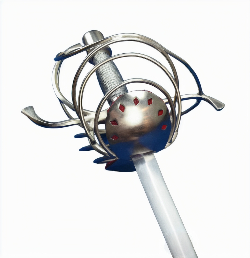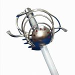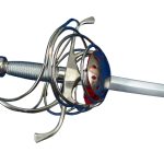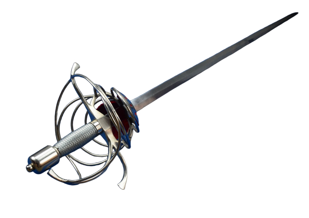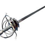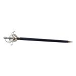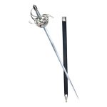 This Rapier has a blade forged from high carbon steel; the complex hilt is mild steel with a wooden grip overlaid in twisted steel wire. The wood-core scabbard is finished with a tight leather wrap and protective steel fittings.