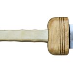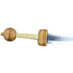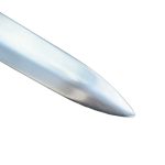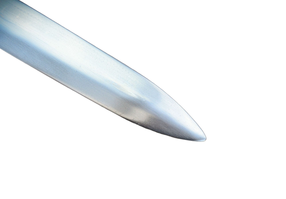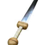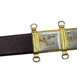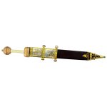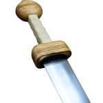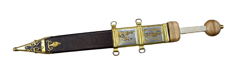 The 3rd Century Zanten Gladius has a blade of high carbon steel and a hilt of wood with a grip of bone. A brass nut caps the pommel and a plate of brass is fitted into the wooden guard. A removable felt tab on the guard protects the guard plate and scabbard mouth from dents and scratches. The scabbard is of wood and brown leather and is embellished with brass and plates of steel and brass. The iconographic plates are fitted on a single side of the scabbard.