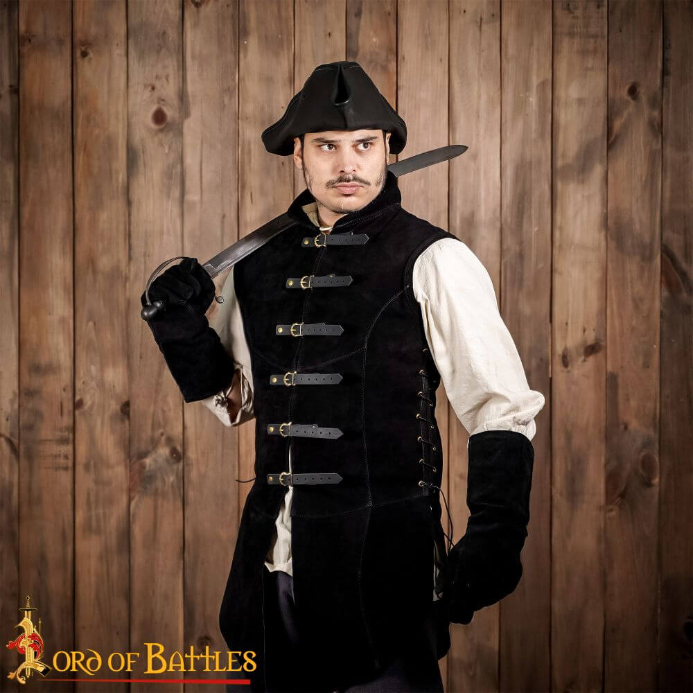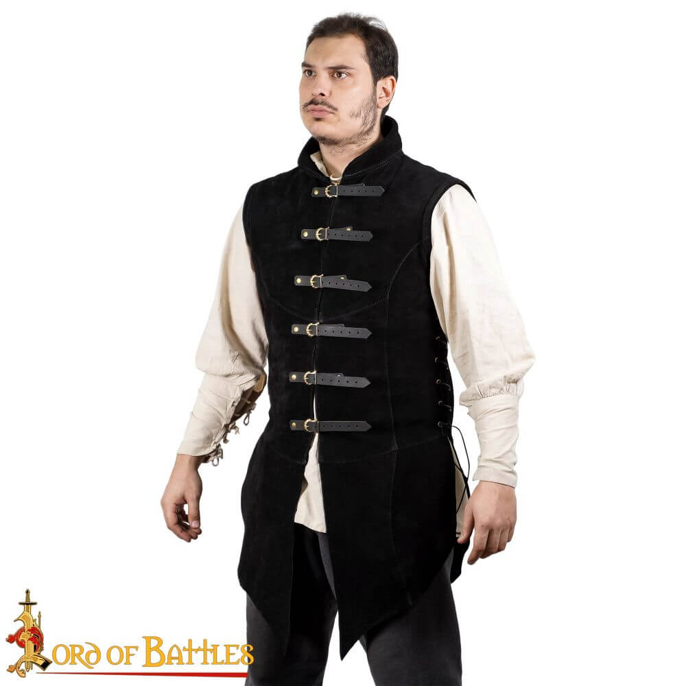 The Adrian is a Medieval / Renaissance Jerkin and is crafted from finely stitched suede leather; it is fastened at the front with a set of thick leather straps and brass buckles. The fit of the jerkin can have its fit adjusted with its side lacing to best tailor it to the individual. It is a fine centerpiece to many Medieval, Renaissance or Pirate ensembles, costumes or outfits.