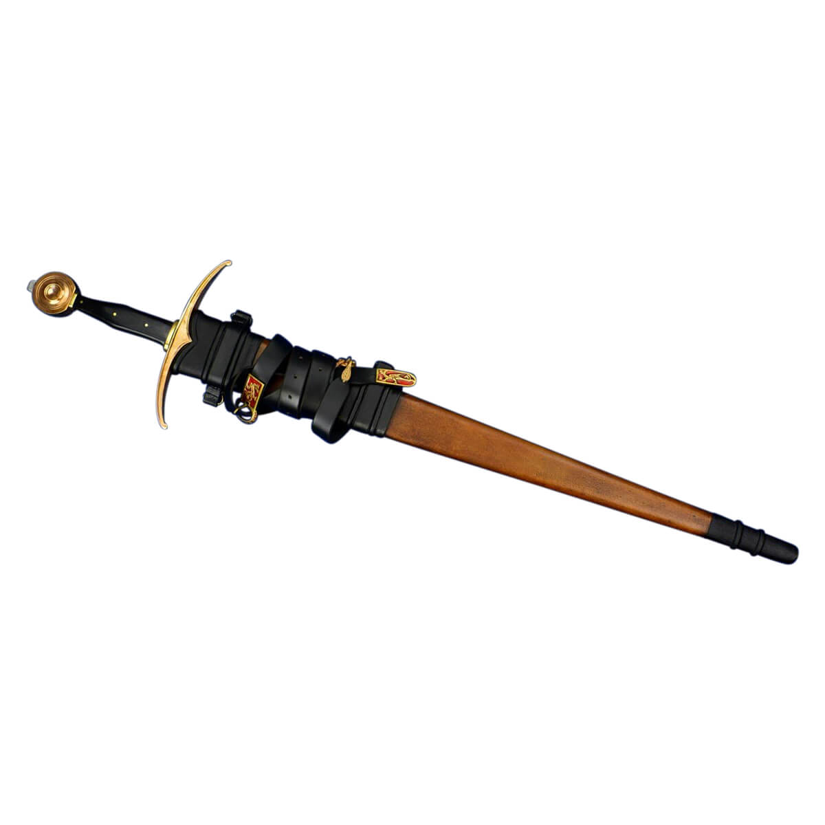The included scabbard is wood with a leather belt and bronze fittings and an integrated sword belt of durable leather.