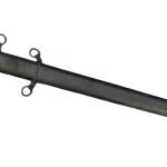 The scabbard is of wood and leather with blued steel fittings and hanging rings knotted to the scabbard in bands of leather.