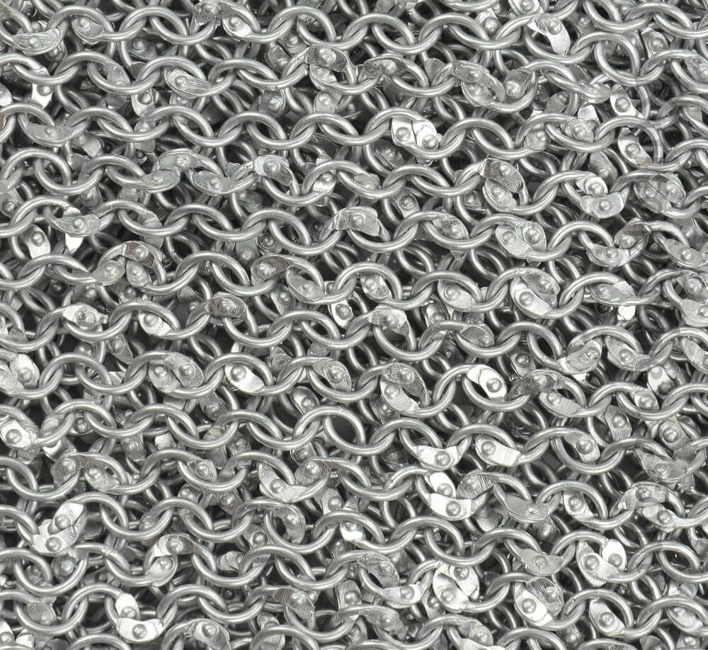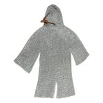 This Chainmail hauberk is entirely made from riveted rings of aluminum to give its wearer the look of chainmail without the weight of standard steel. Aluminum chainmail weighs much less than standard and is perfect for long days of costume or reenactment when the weight of steel chainmail can become quite burdensome over the length of a day. This hauberk has an a coif with a face cover riveted into the hauberk a method done to give seamless protection to most of the head. The coif also has a face cover which can be tied behind the head to grant protection to much of the face.