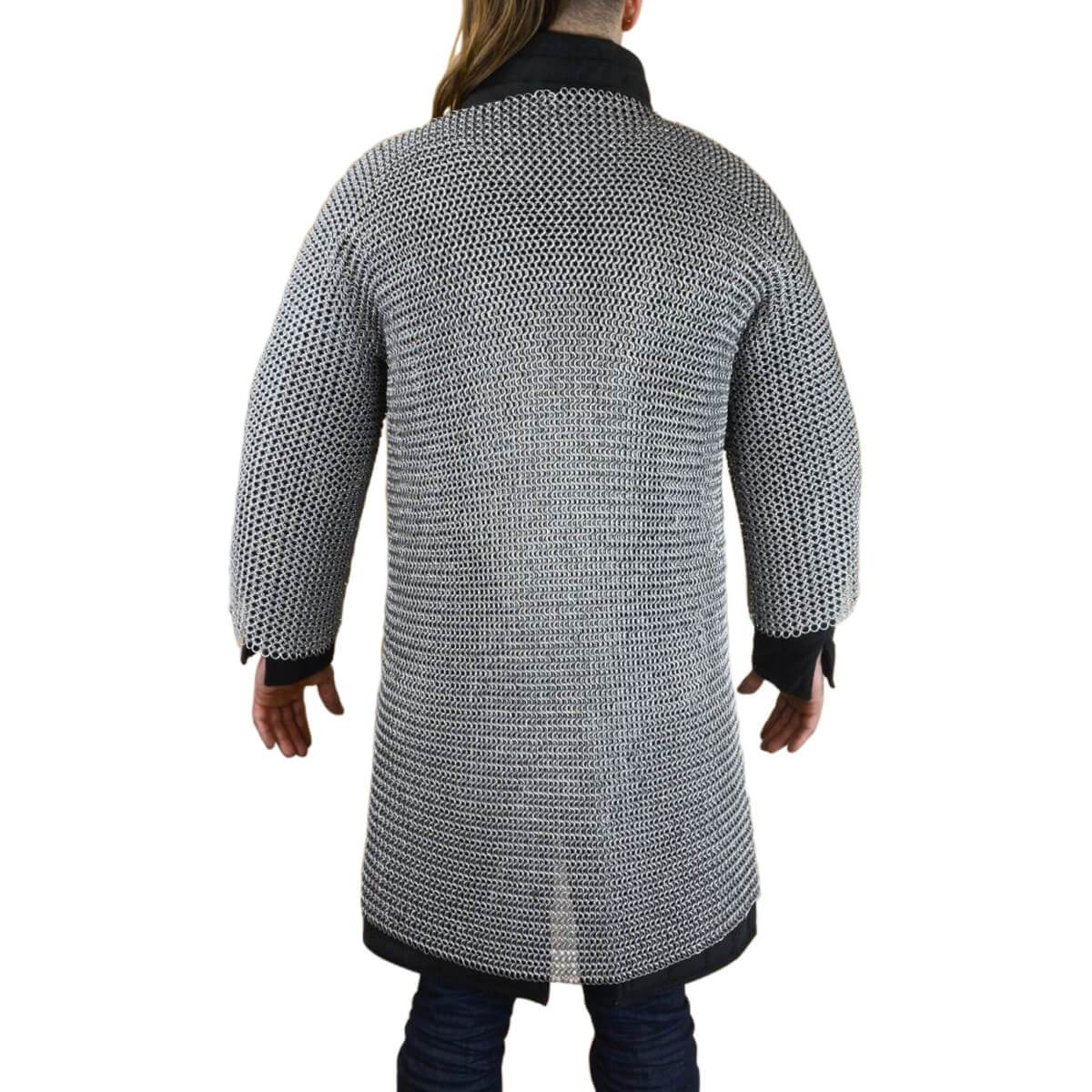 Substantially more lightweight than standard chainmail, this aluminum 3/4 sleeve hauberk will be far less taxing to wear for a full day at the Faire or for reenactment. With butted mail the links tend to be pulled open and fall off in the armpit area and this hauberk avoids that problem entirely by leaving the armpits open.
