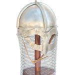 This recreation of the Gjermundbu helm has been crafted to give it an antiquated appearance. It has been artificially pitted for an aged texture and dark oils in the recesses give it the effect of having trace rust. It is crafted from 14 gauge steel. The Interior is lined with an adjustable leather liner that has been glued to the helm interior. It has an integrated chin strap with an adjustable buckle. An aventail of butted chainmail has been added to complete the helm.