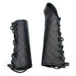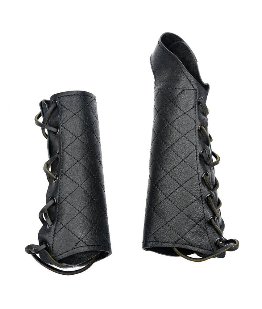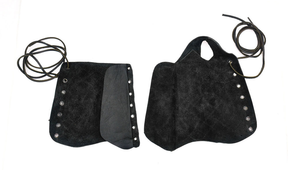 This set of leather gauntlets are perfectly suited for an archer; the right gauntlet has integrated protection for the palm of the right hand and its seamless connection to the forearm of the gauntlet ensures that there is no gap for an errant bowstring to pass through to strike the wrist. The leather is supple and high quality with finely stitched construction. The gloves are donned and adjusted to size with the leather cords and blackened metal eyelets.