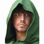 Highlighted by brown medieval trim on tunic and hood