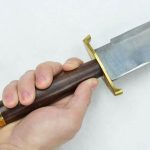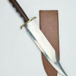 The Arkansas Bowie has a blade of high carbon steel, a grip of wood and a pommel cap and guard of brass. The sheath is of stitched leather.