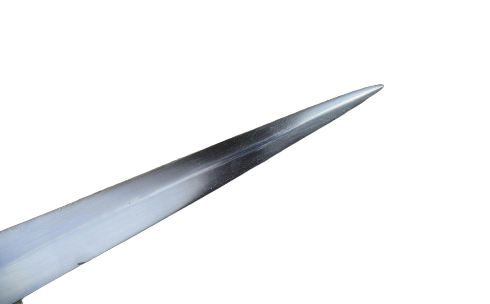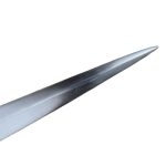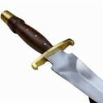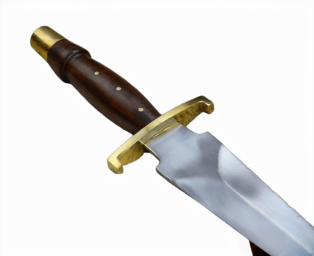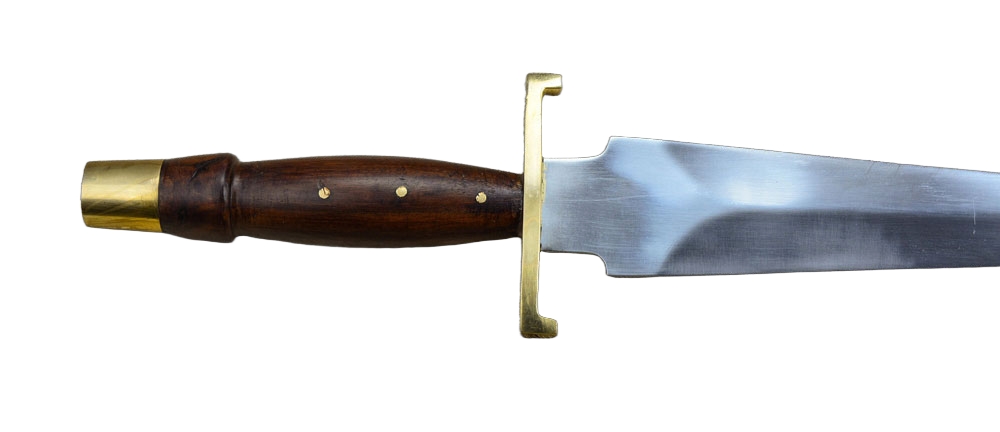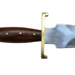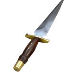 This Arkansas Toothpick has a blade crafted from high carbon steel; the hilt is brass and wood and the included sheath is stitched leather with an integrated belt loop.