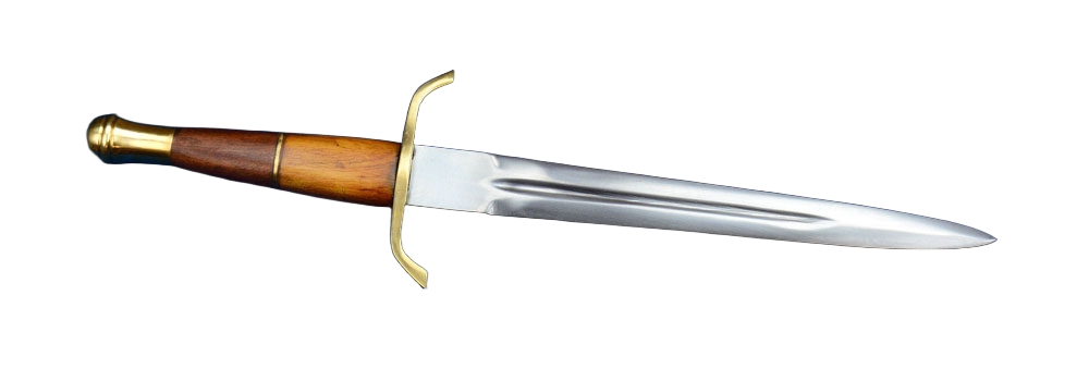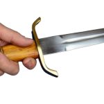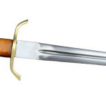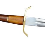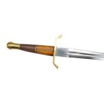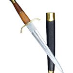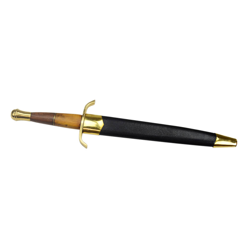 The Arming Dagger has a blade crafted from high carbon steel; the guard and pommel are brass and the grip is carved wood with a brass washer. The wood-core scabbard is overlaid in black leather and completed with brass fittings.