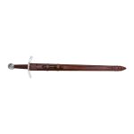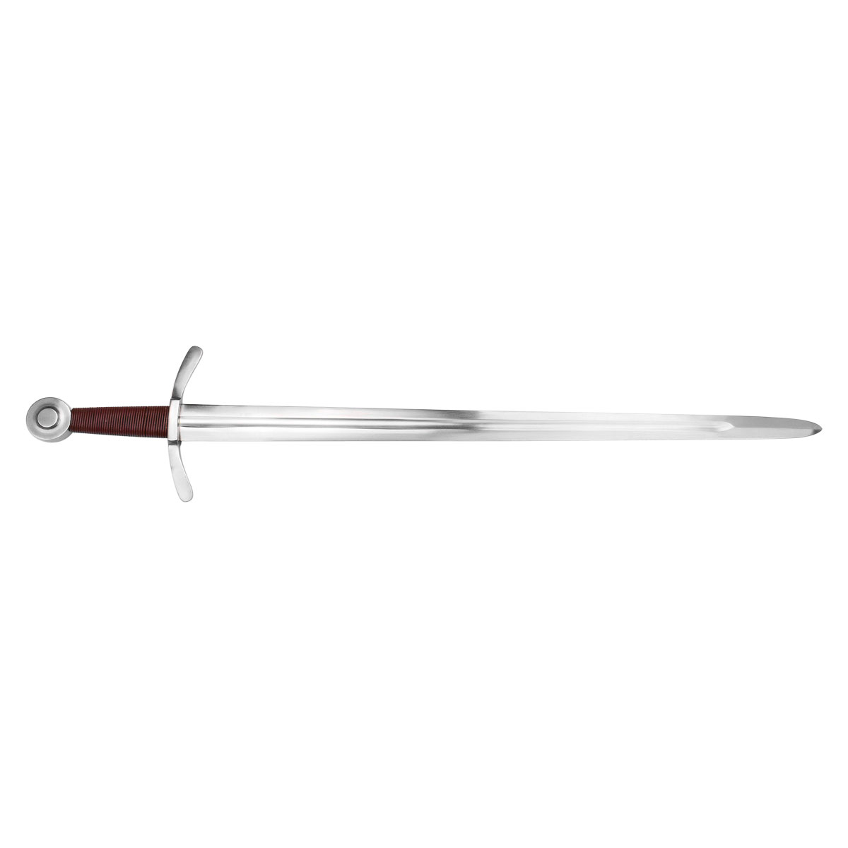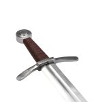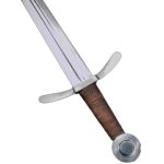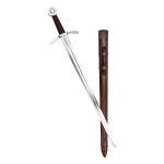 Made by Deepeeka, this sword has a high carbon steel blade. The hilt fittings are steel and the grip is tightly wrapped in brown leather cord. It comes with a wood-core scabbard covered in light brown leather and affixed with a wooden suspension loop.