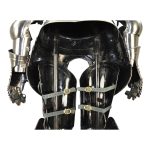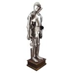 Although eminently suitable for display, this armor is fully articulated (Many of the pieces are wearable, but others will need some modification in order to be worn). It can be worn by a person who is approximately 5 10 to 6 feet tall. (177 cm – 182 cm) The plates are crafted from 18 gauge high carbon steel.