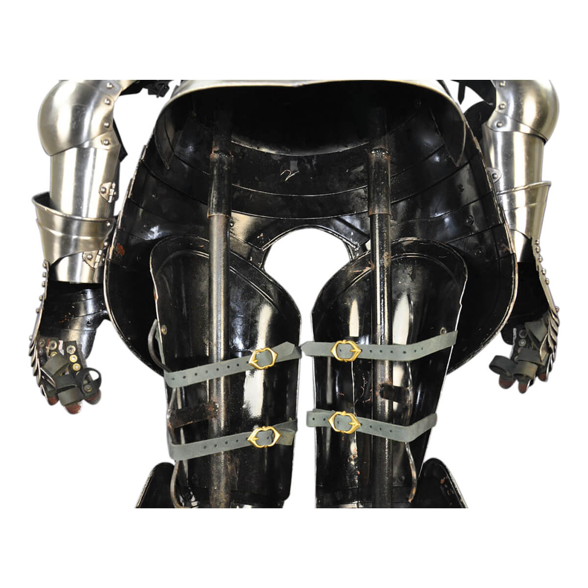 An array of leather straps and brass buckles are used to hold the armor together and to attach it onto a person if desired. The armor is crafted with the expectation that someone who is wearing it will wear a padded gambeson beneath, as well as gloves and boots. The close-style helm has an integrated, adjustable leather suspension lining and a leather chin strip with brass buckle for adjustment. The helmet can be opened and closed with the use of a side hook.
