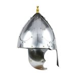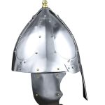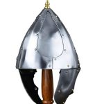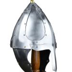 This Migration Era / Dark Ages helmet is crafted from carbon steel with its separate plates are riveted together a robust construction. The plates are a combination of 16 and 18 gauge in thickness. The cheekplates are hinged and have integrated steel rings which allow for them to be tied into position under the chin.