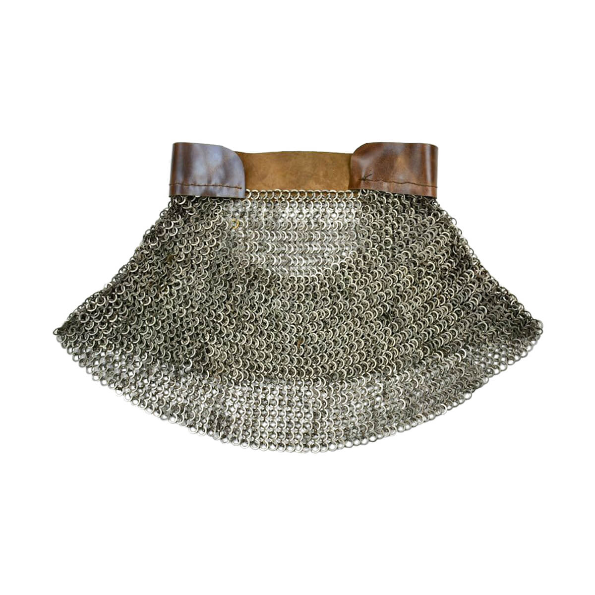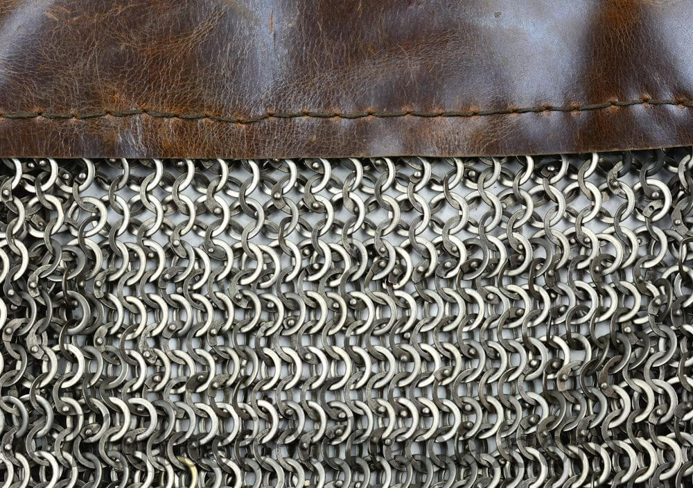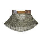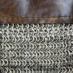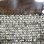 This aventail is intended to be riveted or laced onto a helmet and it is crafted from a band of thick leather for a base. The chainmail rings are dome riveted flat rings alternating with solid flat rings of mild steel and these are sewn onto the leather band. The rings measure 9 mm in diameter and 18 gauge in thickness.