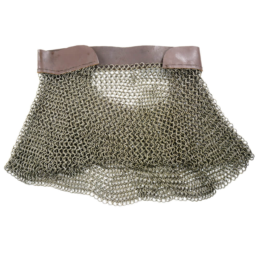 Give your neck and shoulders maximum protection with the Aventail for Helm. Authentically designed after the popular chainmail armor of the Middle Ages which incorporates interlocked metal rings in a pattern, this piece features high tensile wire round rings with butted construction and a natural finish. Each ring has an 16 gauge thickness and measures 9 mm in diameter. A leather band serves as a base for the chainmail to be sewn into and allows for riveting to a helmet. Great for costumes and re-enactments and a wonderful addition for armor connosseurs and medieval enthusiasts. Length of Leather Band is 24”