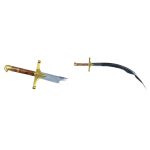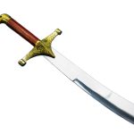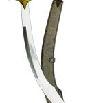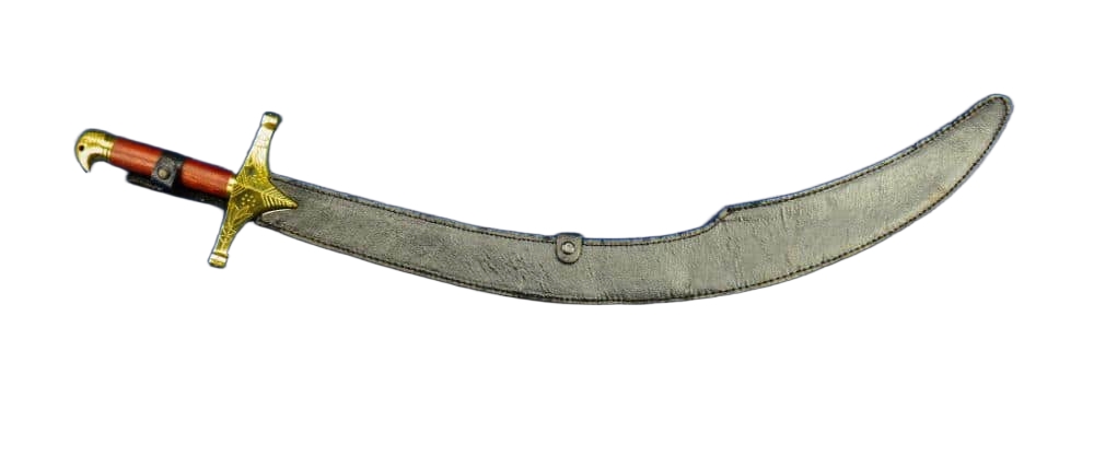 This embellished version of the balancing Baladay Scimitar has a brass hilt that is lavishly etched with leaf and scrollwork design. The grip is crafted from polished wood and the blade is forged from unsharpened high carbon steel that is polished to a mirror finish.