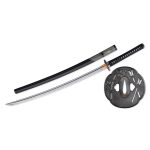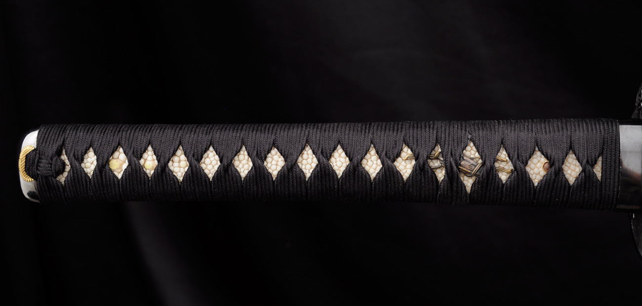 The “tsuka” or handle and “saya” or scabbard are hand carved to fit each individual blade ensuring a proper fit. The handle is wrapped in genuine imported silk form Japan and tightly wrapped around the full same-gawa or ray skin wrap around the wooden core. The saya is lacquered in black to a nice semi-gloss finish with a ray skin wrap near the mouth of the saya to strengthen this area.