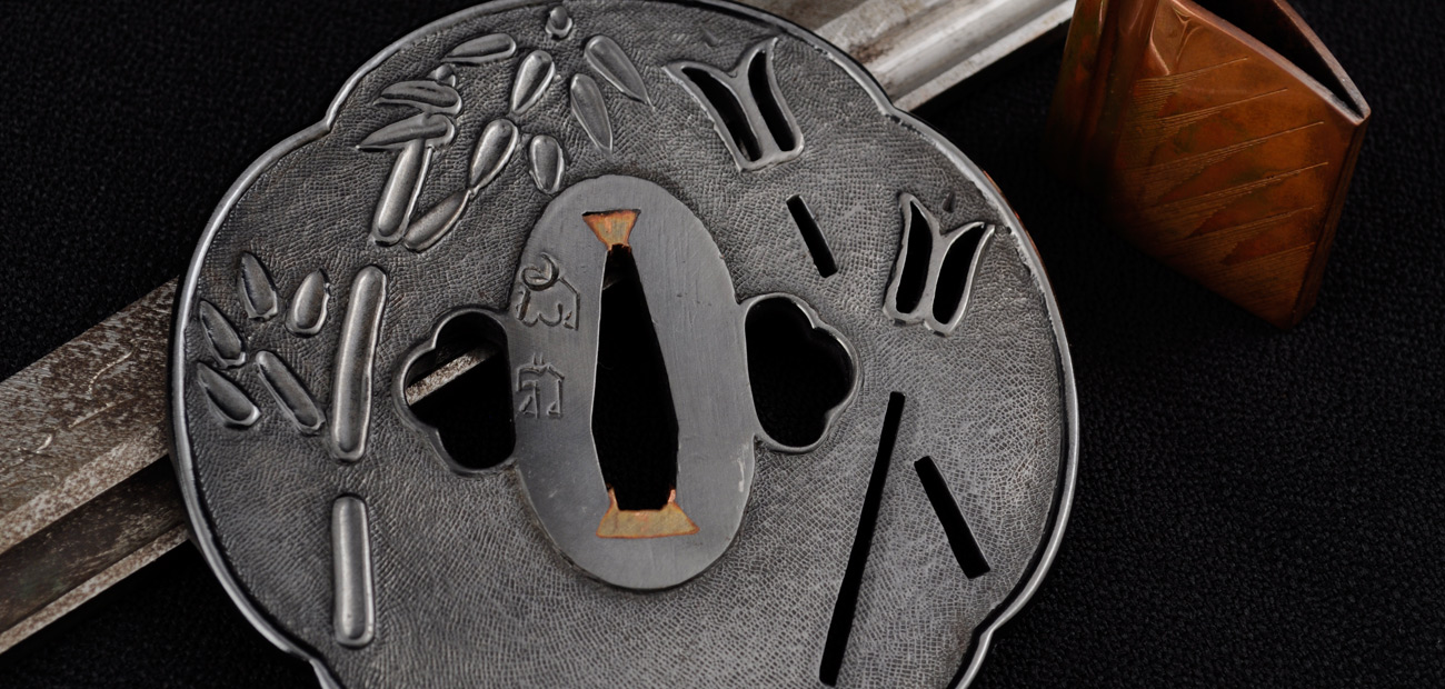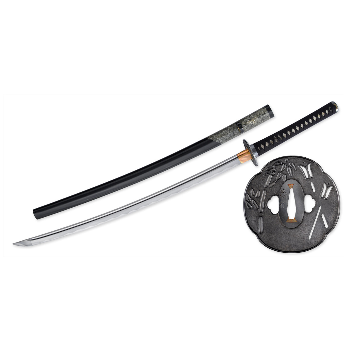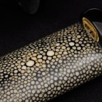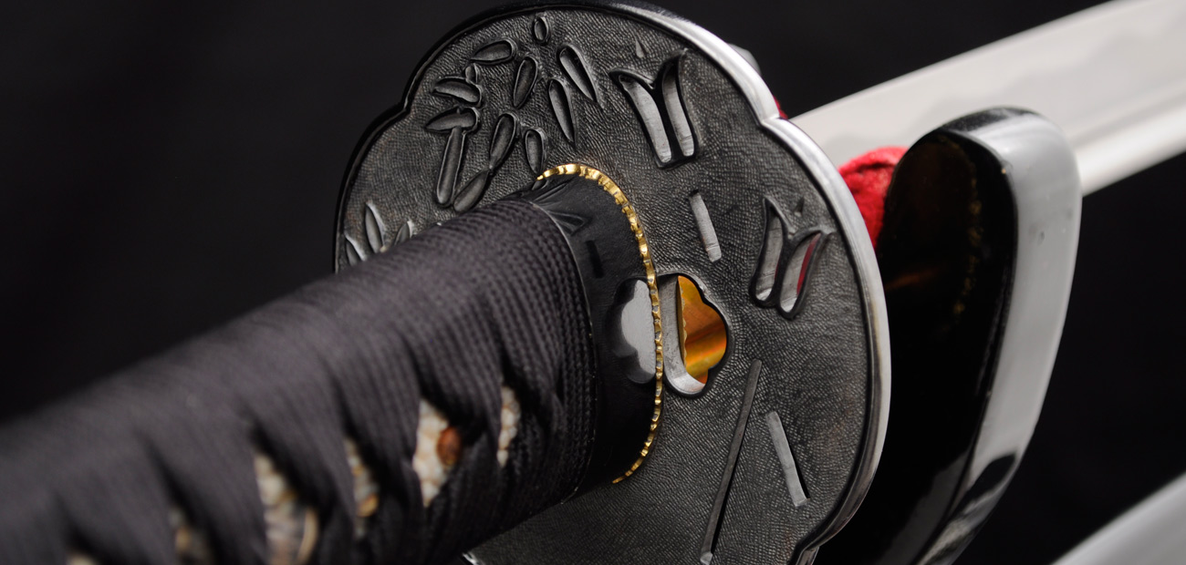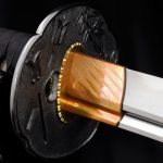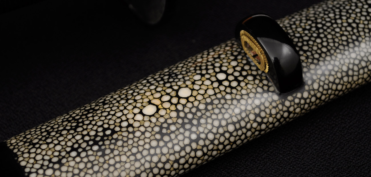 The tsuba is hand cut and engraved from pure iron. The “nanako” or stippled pattern on the tsuba is accomplished by hand, quite a feat of patience with a stunning result. The tsuba also features “seki-gane”, metal inserts at the top and bottom of the hole for the blade to slip through. These are of a softer metal (copper) than the iron of the tsuba and allow easier shaping of the hole to perfectly fit the tsuba to the blade. Over time if this fit becomes loose or the tsuba is fitted to another blade the seki-gane may be adjusted easily to tighten it back up. This is a small detail usually only found on hand-made Japanese tsuba and is indicative of the level of care and craftsmanship given to these swords by Citadel.