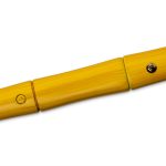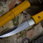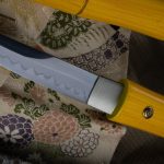 No doubt, solely conceived in the mind of Frenchie Jin, this exquisite and unassuming conceals more than just a cool piece of steel in a bamboo motiff. Place your thumb on the circle on the saya to know the direction of the blade edge, and your other thumb on the highly detailed mon on the handle to draw it open. Cleverly concealed, the choji hamon pattern whisps across the 5″ T10 blade to the silver habaki. The tapered mune (spine) sweetens lines on this piece making it a singular piece of sword art.