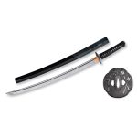 The “tsuka” or handle and “saya” or scabbard are hand carved to fit each individual blade ensuring a proper fit. The handle is wrapped in genuine imported silk from Japan and tightly wrapped around the full same-gawa or ray skin wrap around the wooden core. The saya is lacquered in black to a nice semi-gloss finish with a ray skin wrap near the mouth of the saya to strengthen this area.