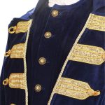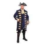 This is one of the most ornate pirate coats we offer. This stately coat is manufactured of lush, blue cotton velvet, sports large period cuffs and a rich brocade with buttons along the open front. Two real side pockets provide a place for your things. An adjustable rear belt with buckle allows for flexible sizing. Sizes S, M, L or XL.