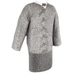 This hauberk is crafted in Code 5 mail, featuring alternating 9mm. diameter dome-riveted flat rings and solid rings in a natural finish. This provided maximum mail protection for the full-contact re-enactor.