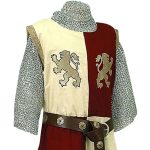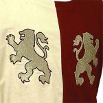 A truly beautiful tunic of the Holy Land; of a heavy weave 100% cotton. Quartered in off-white and blood red panels with back-to-back gold embroidered lions rampant and antique gold trims. Dry clean only.