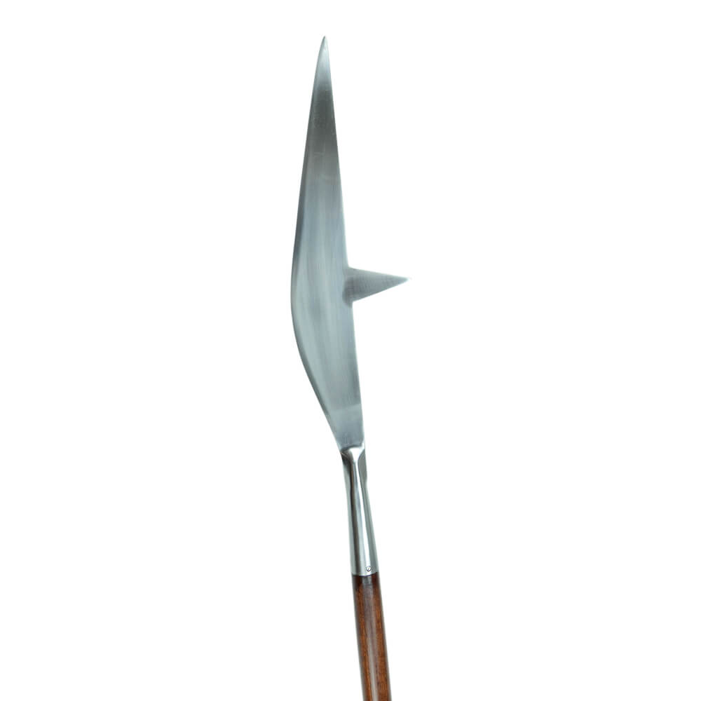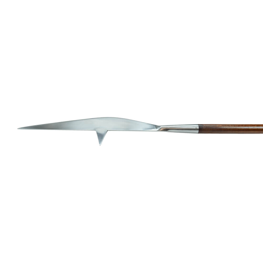 This polearm has an unsharpened head of high carbon steel that is pinned and mounted onto a hardwood haft.