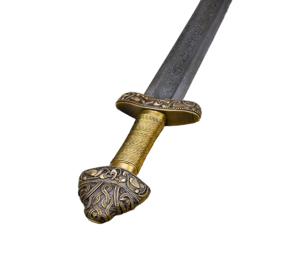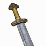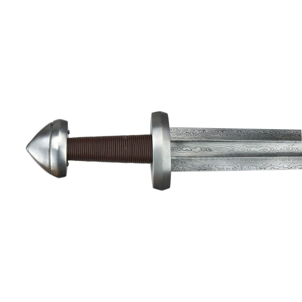 Modeled after historical examples from the Birka Viking site in Sweden, this Viking sword has a blade forged from damascus steel. The crossguard and pommel are steel and the wooden grip is wrapped in leather cord.