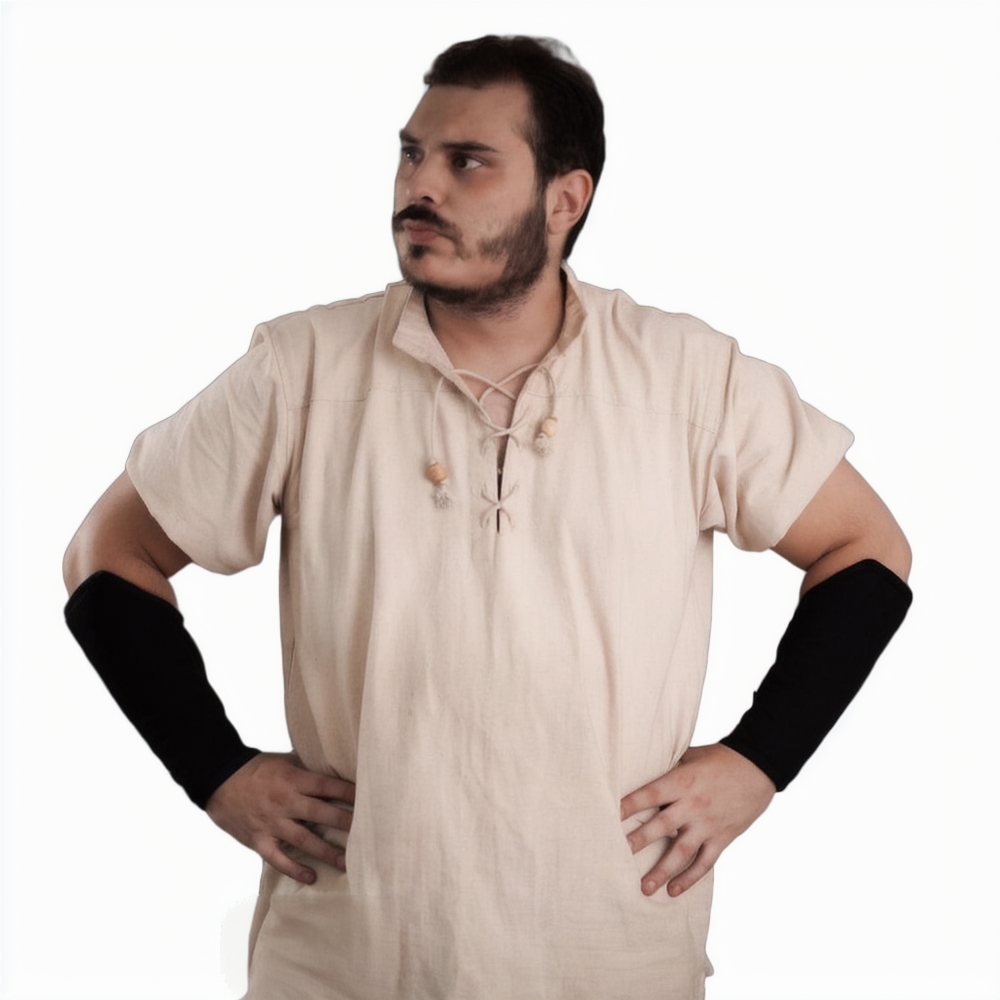Give your arms the comfort and protection they deserve with the Black Cotton Bracers. Nothing beats the touch of cotton craftsmanship with natural wool padding resting against your skin. To ensure a secure fit, leather cord lacing is included. With authentic design, these bracers are great for costumes and re-enactments. Overall Length: 10 1/4”