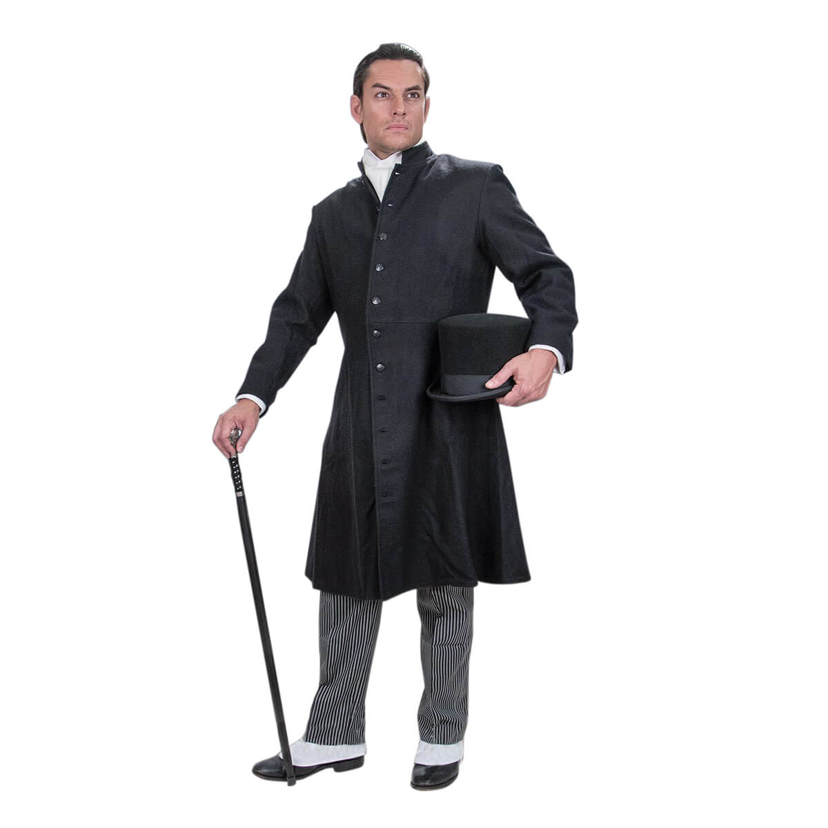 Popular throughout the Victorian and Georgian period of England, this multipurpose coat is dashing for both gentleman and commoner alike. Our version is an acrylic wool blend and sports metal buttons. Slit pockets on the side and an adjustable rear belt allow for a perfect fit. Black only, order sizes M, L or XL.