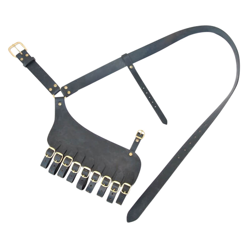 Equip yourself for adventure and excitement with the Black Rapier Belt (Right Handed). Rapiers emerged in the 15th century and were commonly used in Early Modern Europe. While on the battlefront, warriors needed a place to store their weapons and this is where this type of belt came in handy. Keeping in line with traditional style, this piece is constructed from black leather and held securely in place with the inclusion of 9 brass buckled straps. Also accompanying is a sword frog which hangs off a brass ring and free-running belt loop. This accessory will ensure your rapier is always close by and is great for costumes and re-enactments. Total Length: 61 7/8″