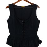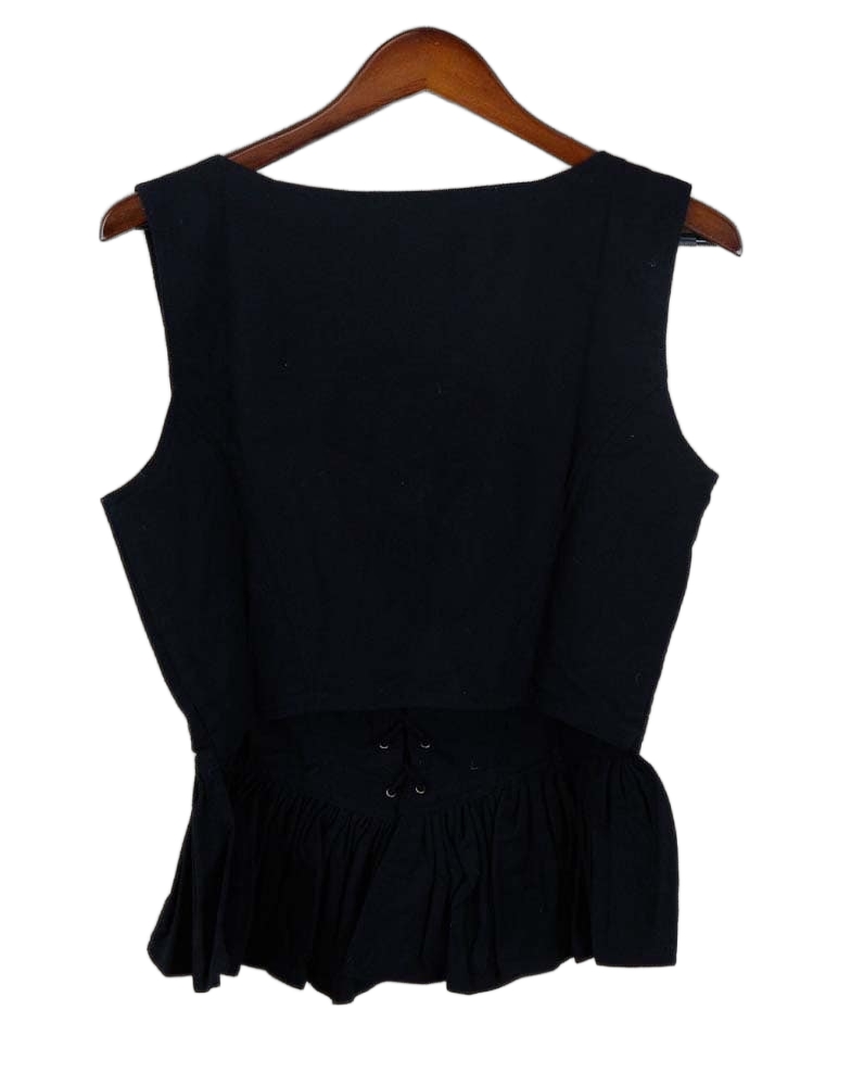This front ruffle-trim bodice is crafted from sturdy cotton, chosen for its durability and breathability. The bodice features strong cotton lacings down the front, allowing for a snug and adjustable fit. Notice how the ruffle trim adorns only the front, tapering smoothly into a shorter back to provide ease of movement and a distinctive silhouette. This particular piece is available in Medium size only, reflecting the typical sizing standards of its era.