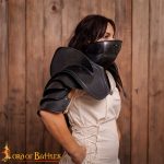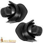 These blackened pauldrons with prominent blade-breakers are composed of riveted and articulated plates of 20 gauge steel; riveted bands of leather give a backing for these articulated plates to move with the upper arm. The pauldrons have a set of buckles to fit them to a gorget or chestplate. Another set of buckles and matching straps fit the lower section to the arm to ensure that the arm plates move in tandem with the arm. The interior of the pauldrons is blackened to hinder rust.