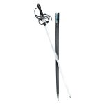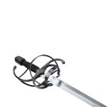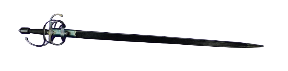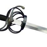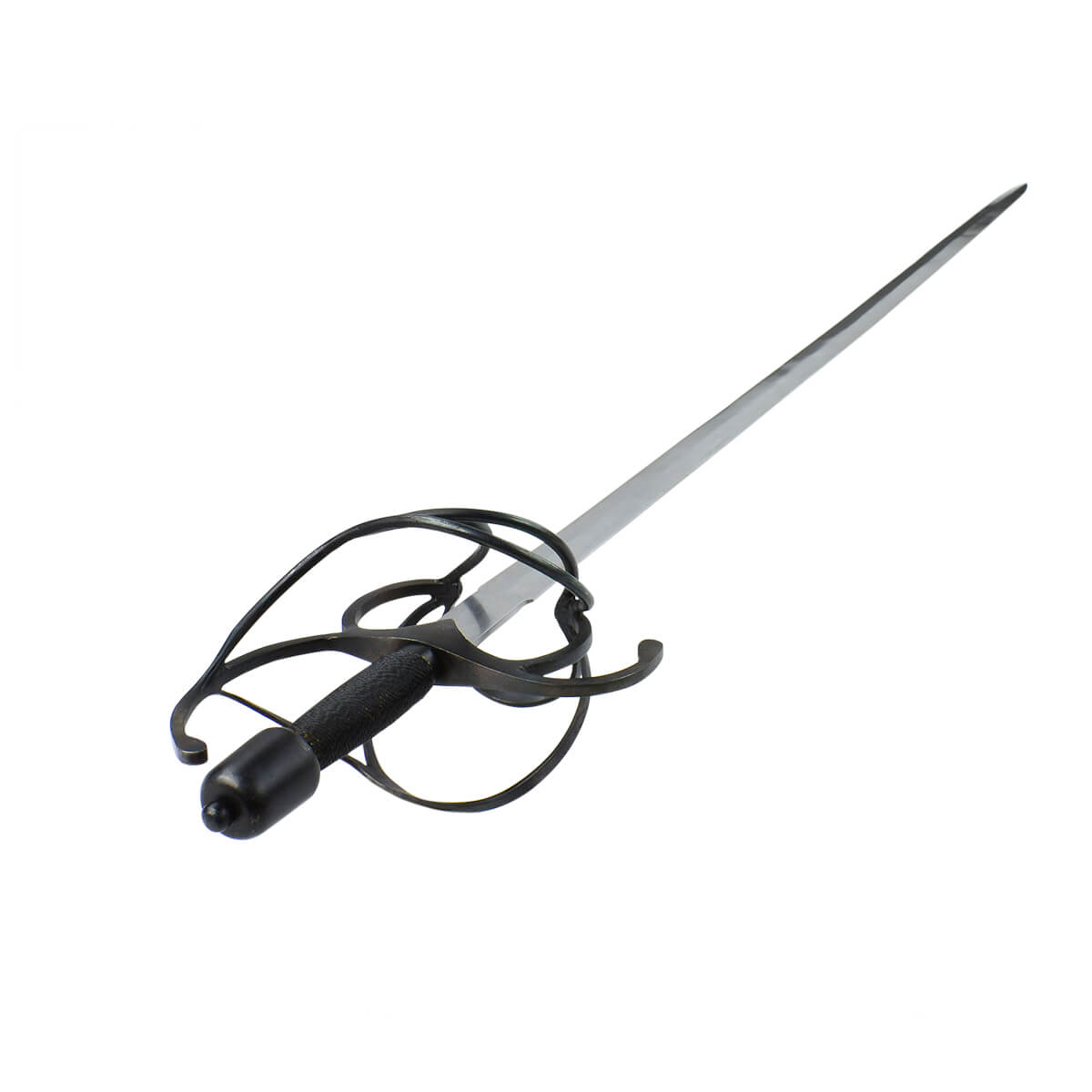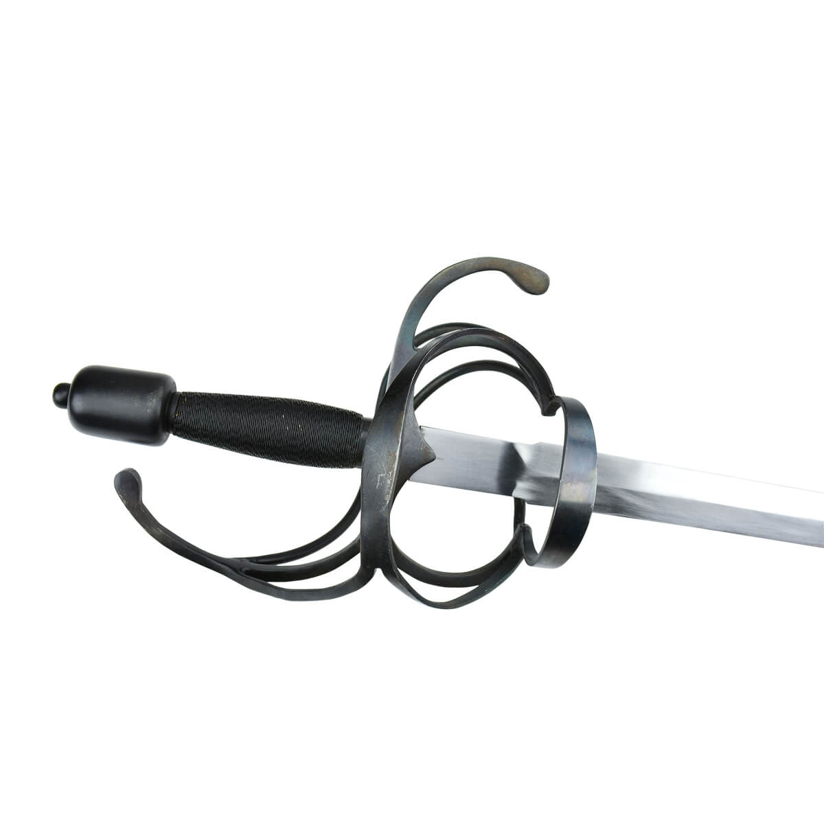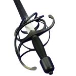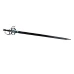 This rapier has a blade of tempered high carbon steel which is mounted into a hilt of blued steel. The wood grip is wrapped in tight brass wire which has been blackened to match. Included is a durable leather scabbard with blued steel fittings.