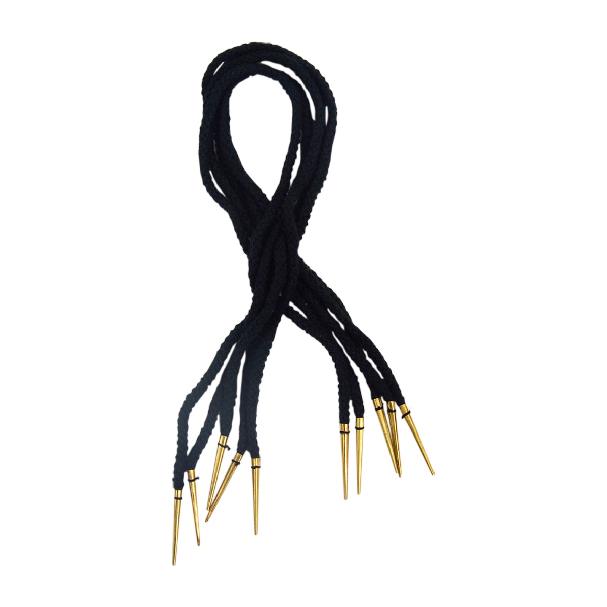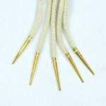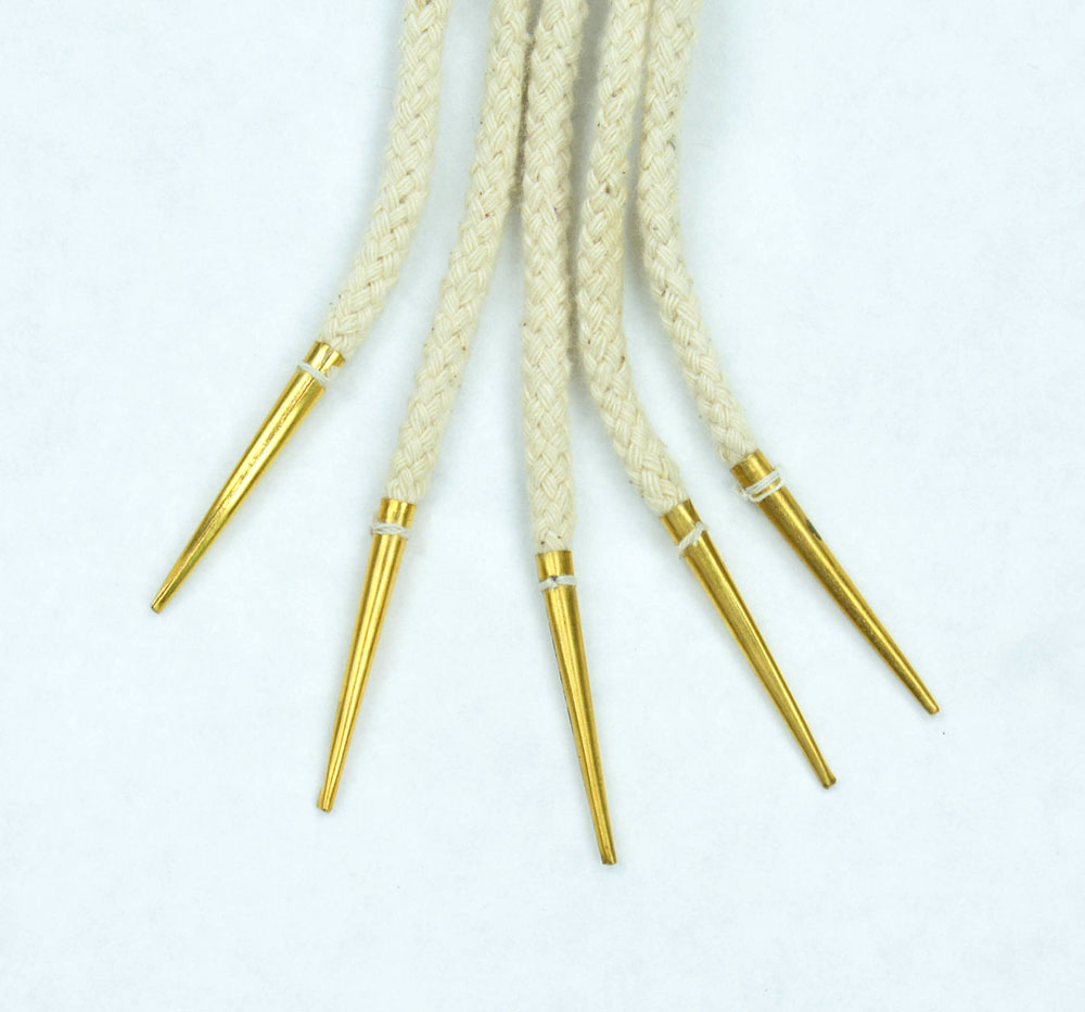 These aiglets of brass are sewn and fitted to cotton cords. They can be used with gambesons, arming doublets and other garments of the Medieval and Renaissance period.