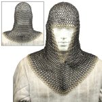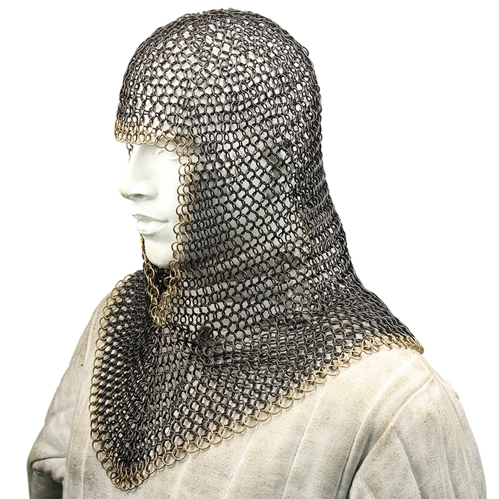 If you are a true enthusiast of the Middle Ages, you owe it to yourself to add the Medieval V Brass Face Mild Steel Chainmail Coif Armor to your collection. Chainmail was one of the most popular armor types during medieval times, as it offered superior protection. It is characterized by metal rings linked together in a pattered formation. Modeled after the original style, this piece is made from 16 gauge zinc plated mild steel and features a 4 in 1 interlocking pattern. It is highlighted by a bottom row of shiny brass links for a radiant accent. This mail hood covers the head and extends down the neck to parts of the shoulder. With authentic design, this coif is great for costumes and re-enactments.