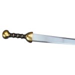 This Roman Gladius has a blade of tempered high carbon steel and a hilt of brass. The grip is wood with brass spacers.
